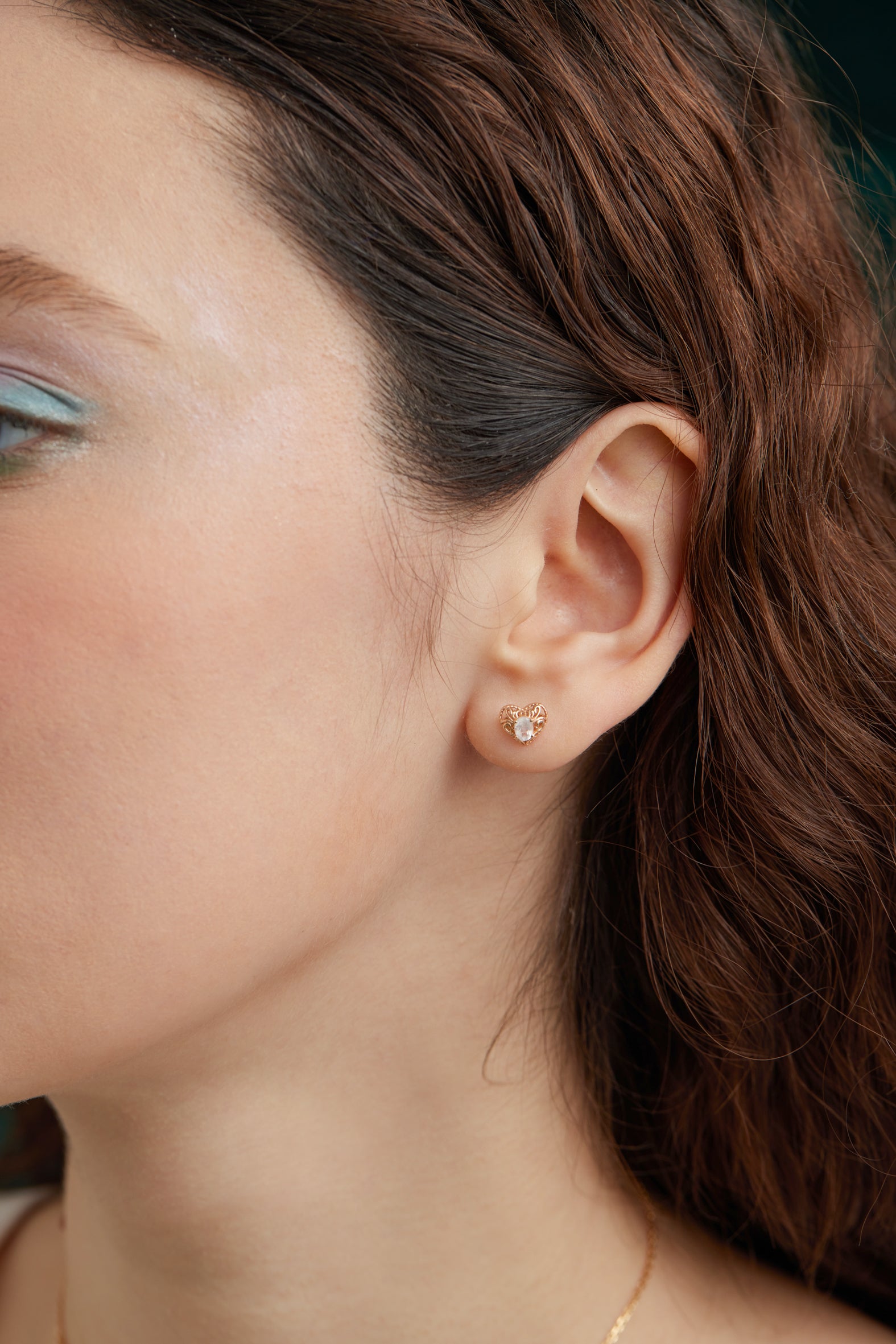 The June birthstone Moonstone is often associated with love, healing, and new beginning. These exquisite earrings are crafted in a heart-shaped design, evoking a sense of timeless romance. Delicate cut-out filigree flower details dance across their surface, artfully inspired by the regal essence of Queen of Hearts and the serene charm of a blooming flower garden.