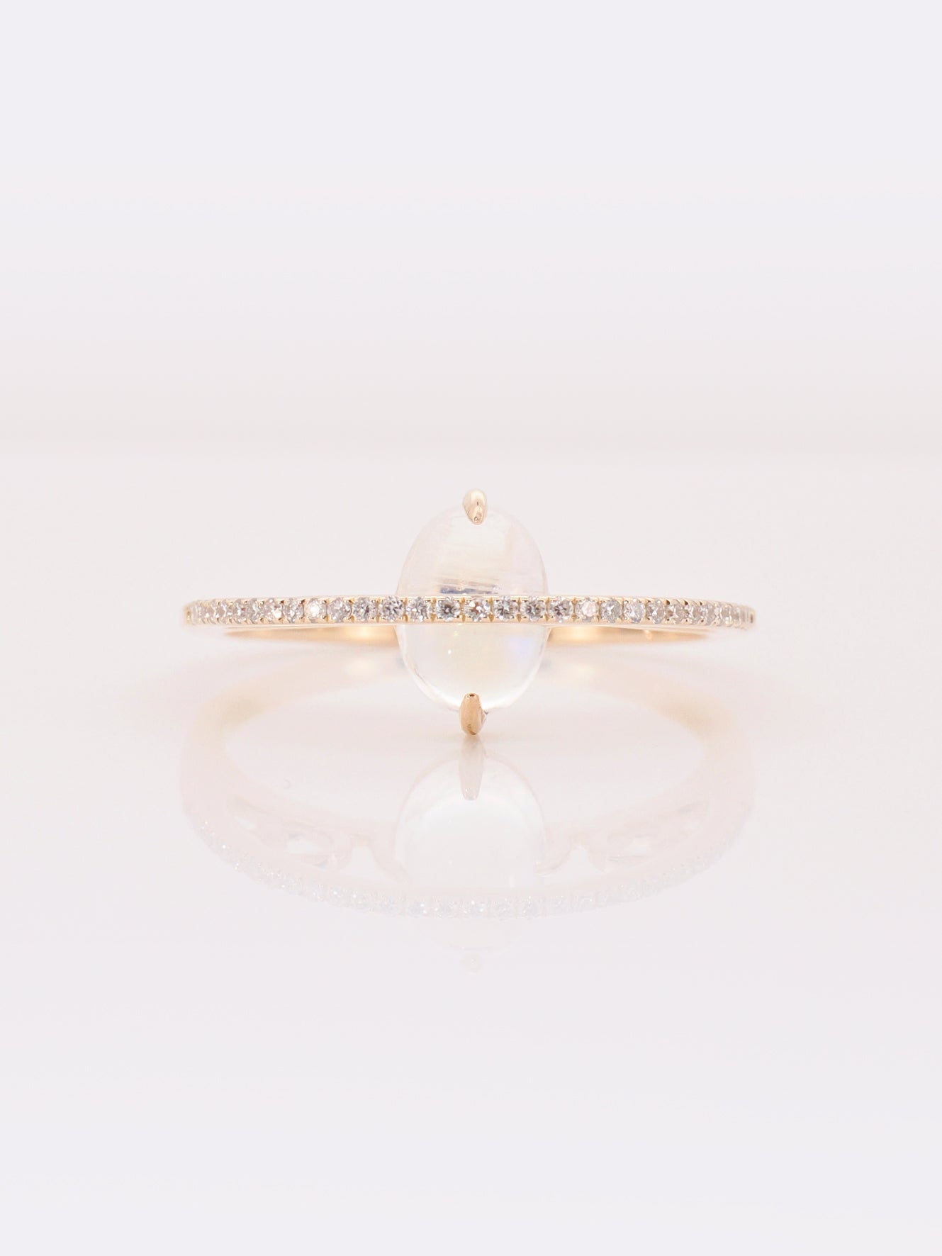This Saturn-inspired ring is crafted in radiant 14K gold and centers on a cabochon moonstone—the June birthstone. A pave diamond bar mimics Saturn’s rings, while a hidden star and moon engraving on the side invite you to explore the beauty within. A celestial symbol of inner glow and cosmic connection.