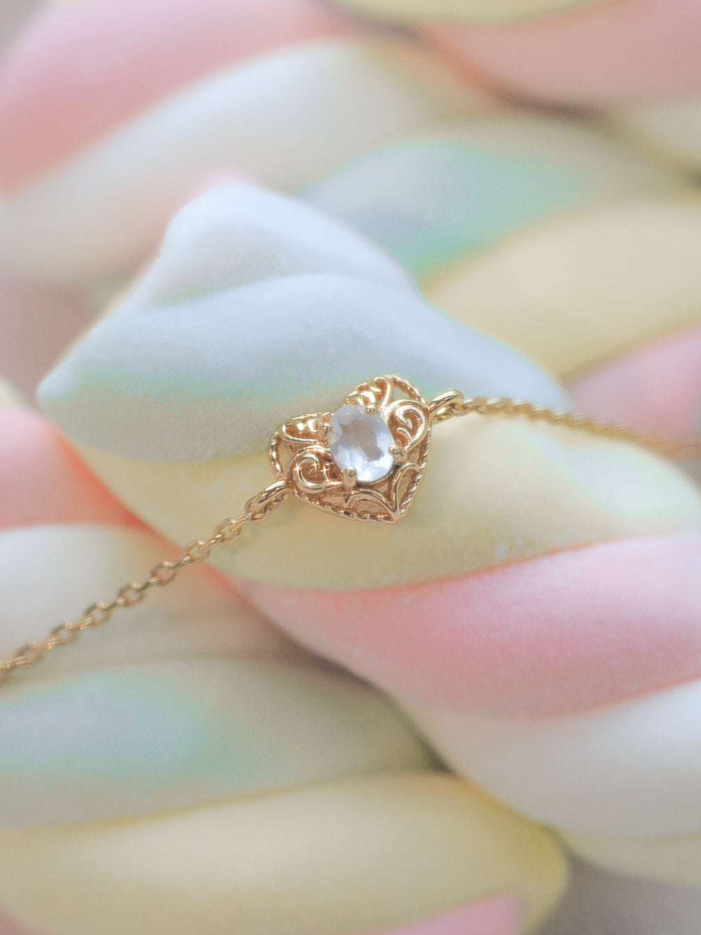 This Qixi special edition bracelet features the June birthstone, moonstone, symbolizing new beginnings, inspiration, intuition, and love. This exquisite bracelet is crafted in a heart-shaped design, evoking a sense of timeless romance. Delicate cut-out filigree flower details dance across its surface, artfully inspired by the regal essence of Queen of Hearts and the serene charm of a blooming flower garden.
