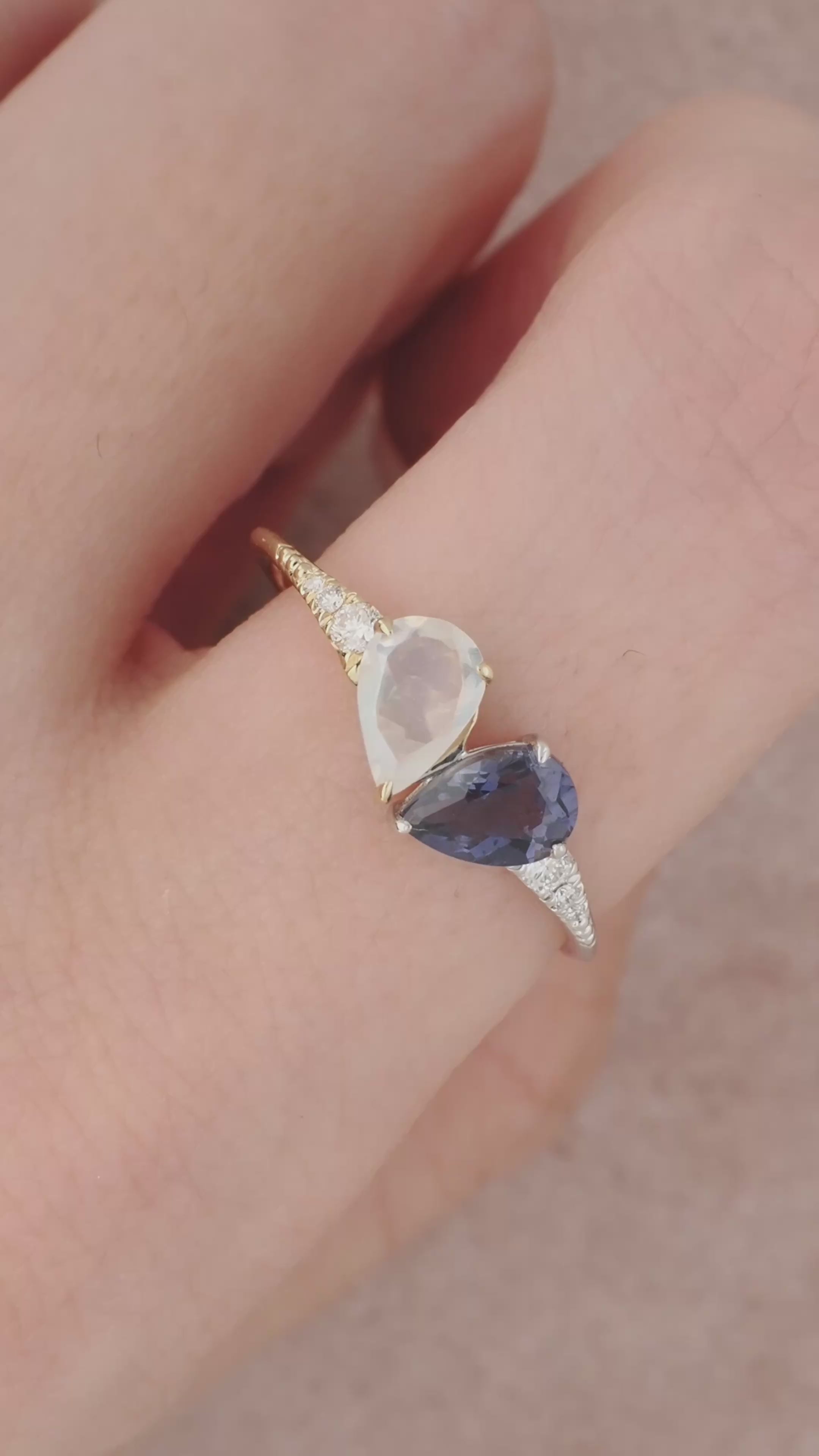 Please specify your ring size and which side is yellow gold and which is white gold in order note / Iolite / Moonstone