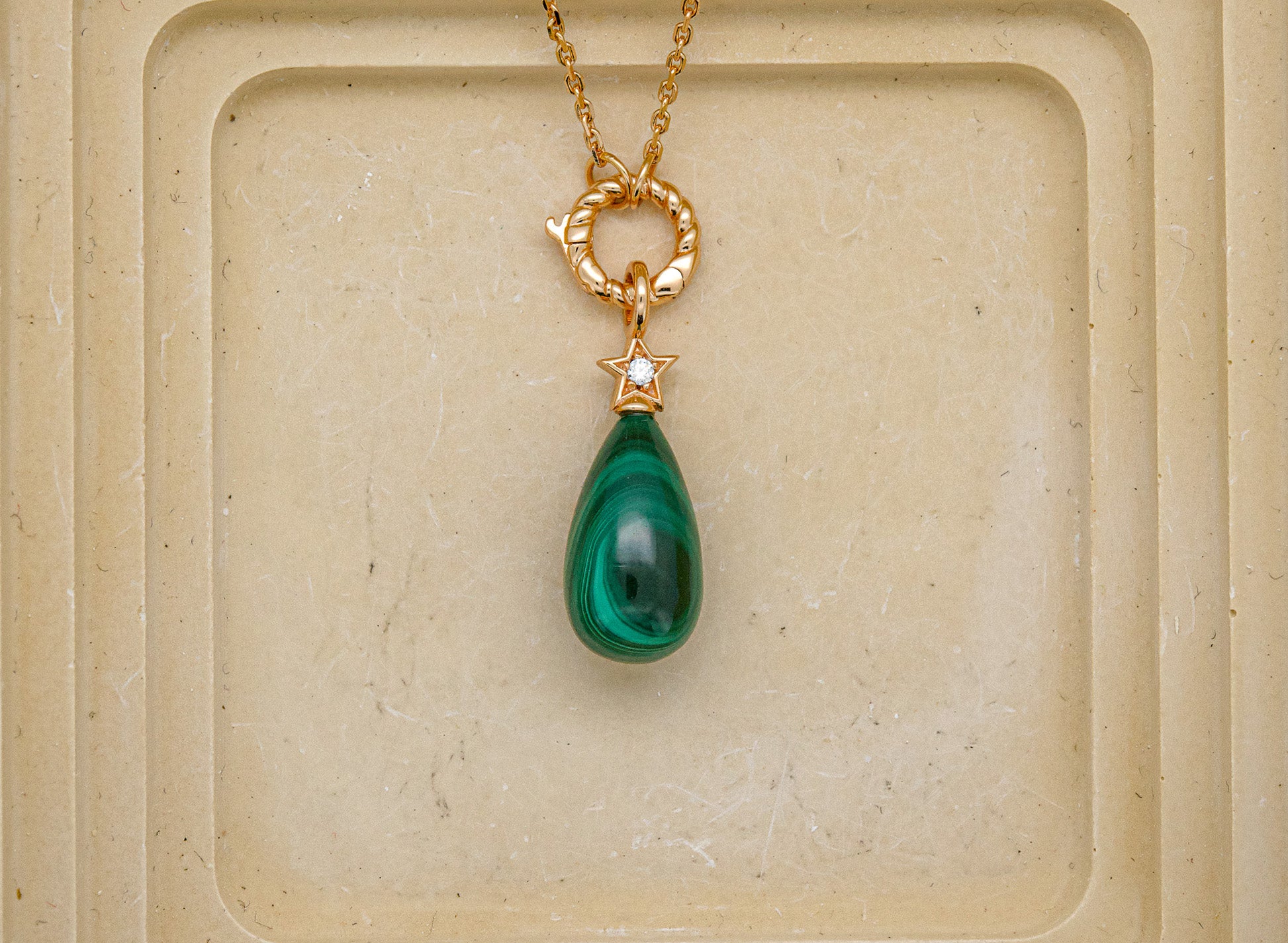 ✦Warm undertones glow with Carnelian and Malachite.