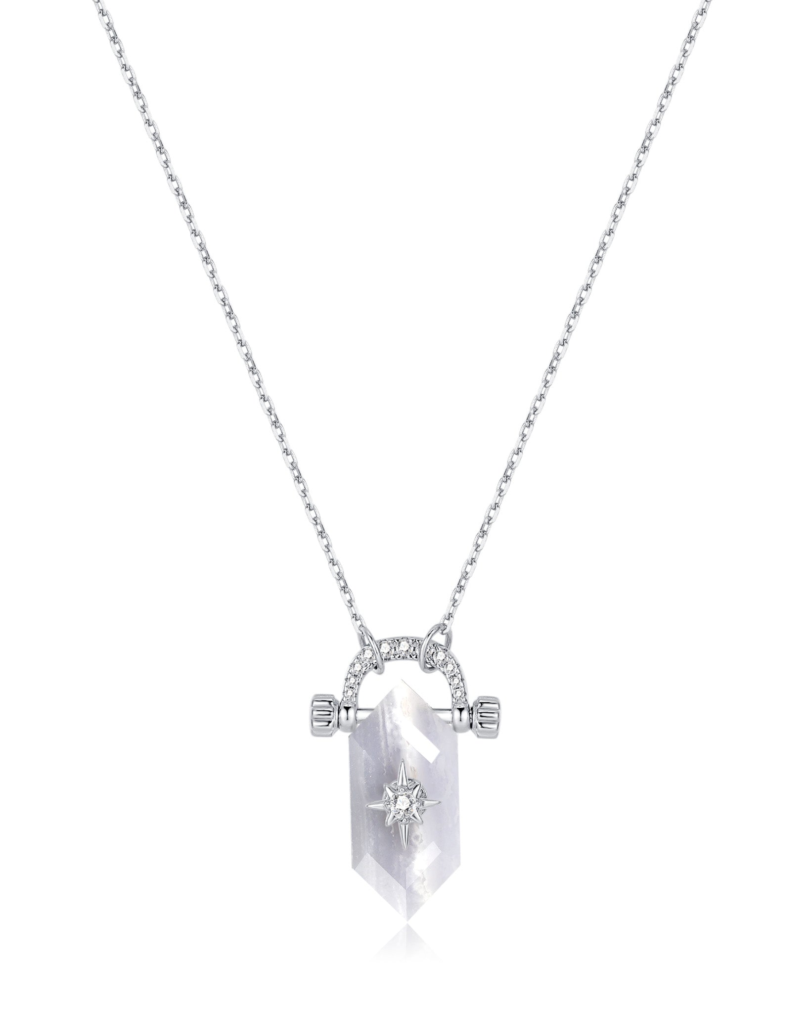 Blue lace agate agate is a stone that symbolizes calm and communication. This pendant features a practical horseshoe shackle design, allowing you to easily unscrew the pin, slide it onto your chosen chain, and secure it back in place.