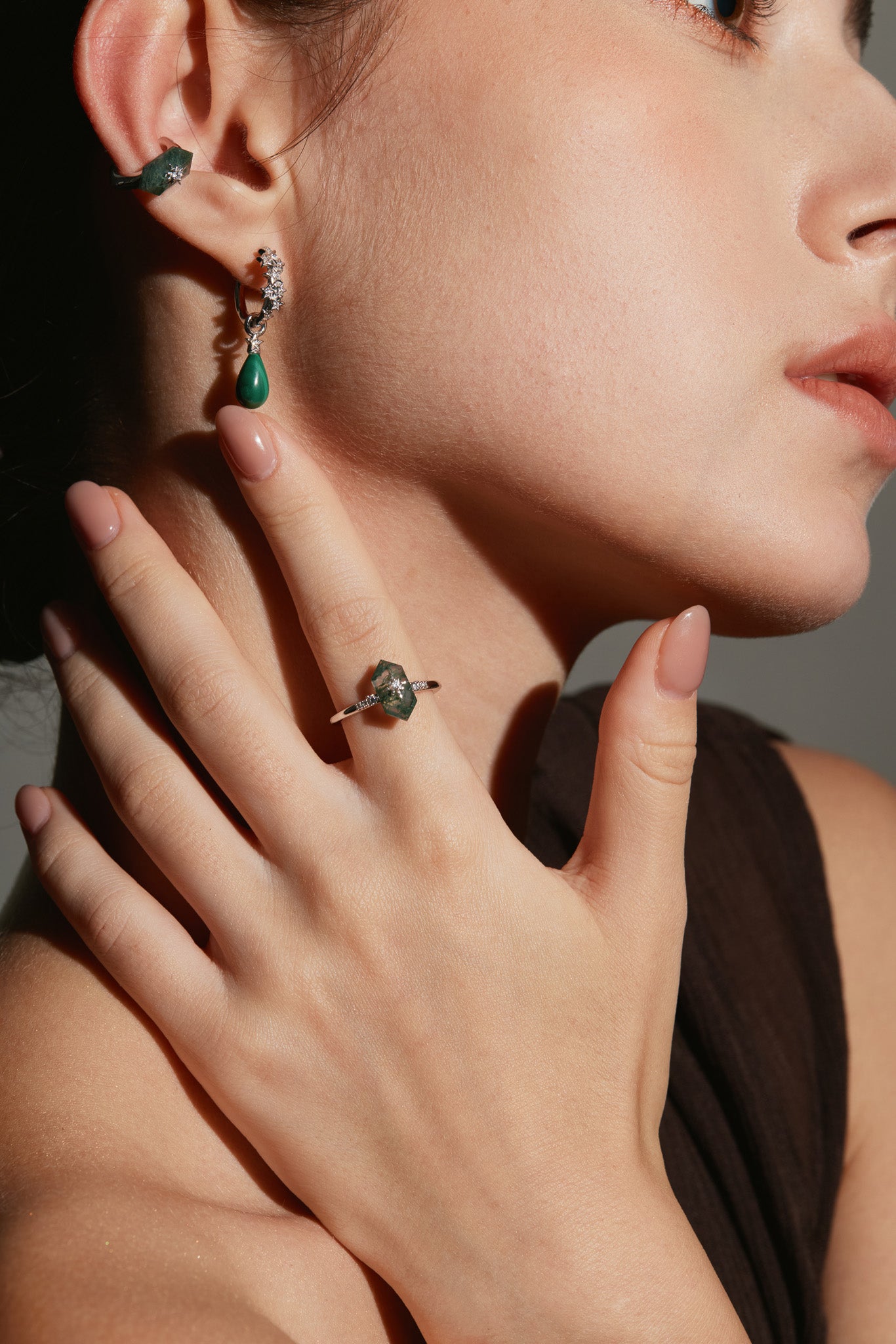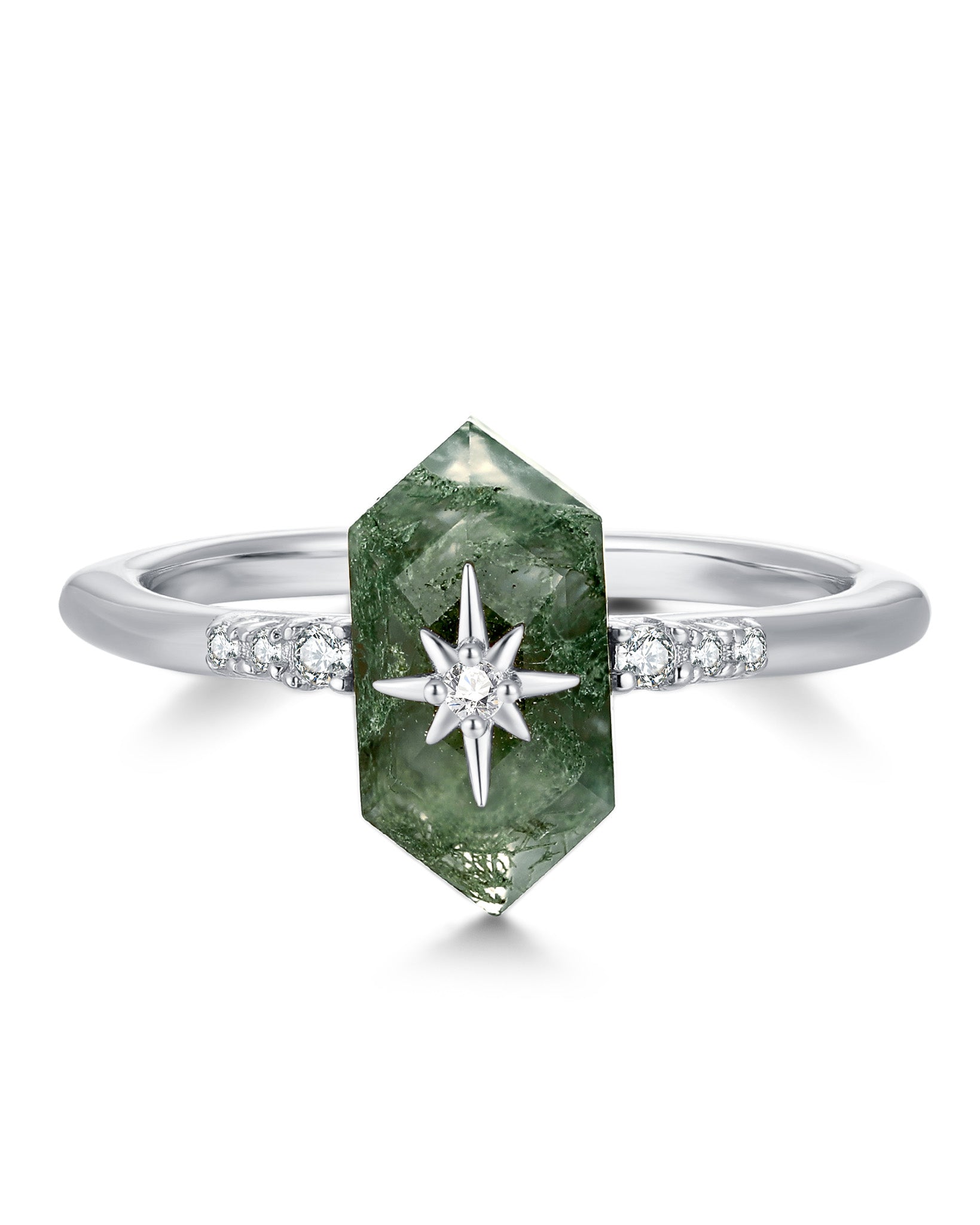 A symbol of abundance and growth, this long hexagon moss agate ring features a delicate star.