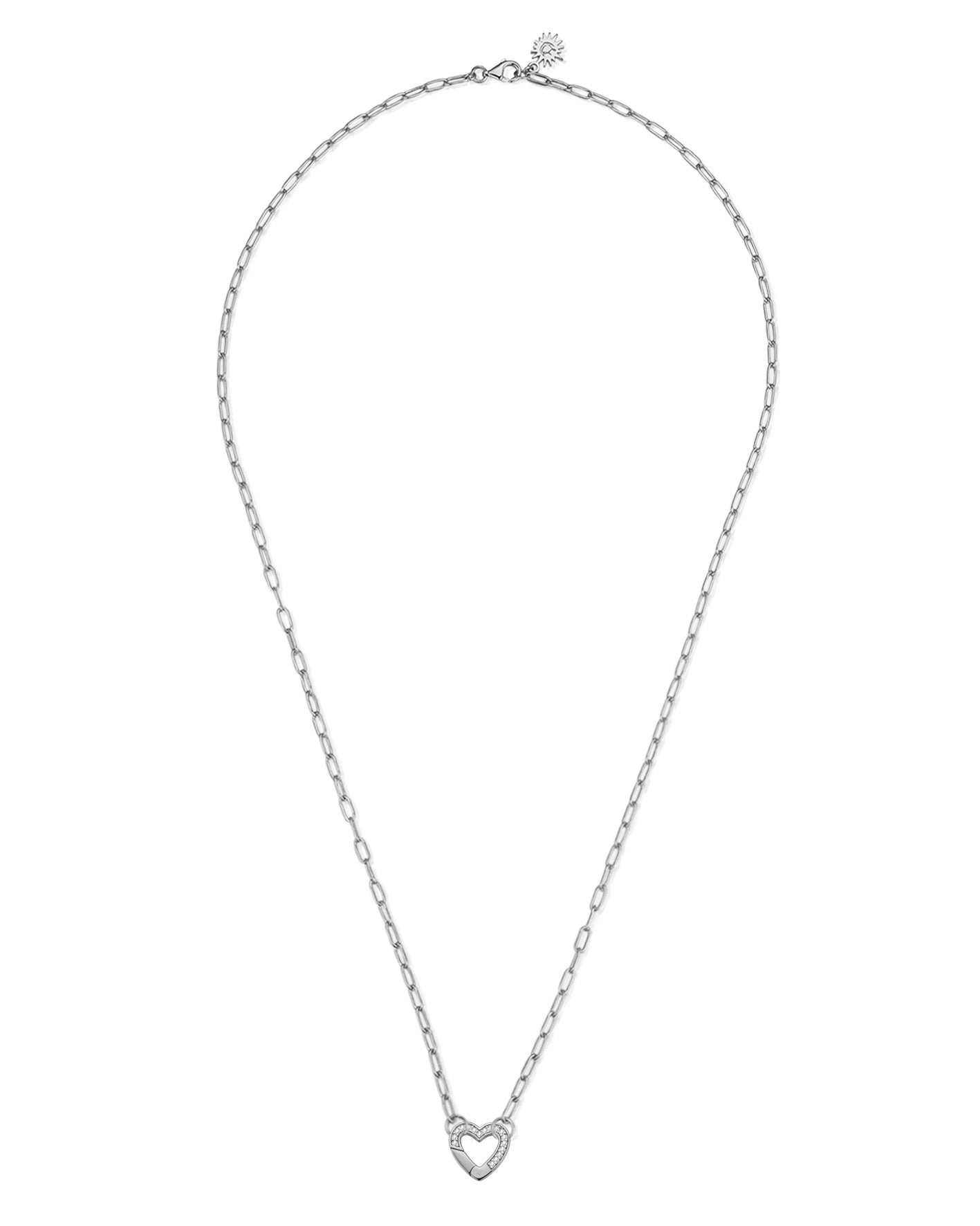 This chain necklace is the perfect way to escape from ordinary jewelry styles. Complemented by a glitter CZ stone heart-shaped charm holder at the front, it allows you to attach any of our pendants. It is designed to embellish your neck and add a touch of elegance and enchantment to any outfit.