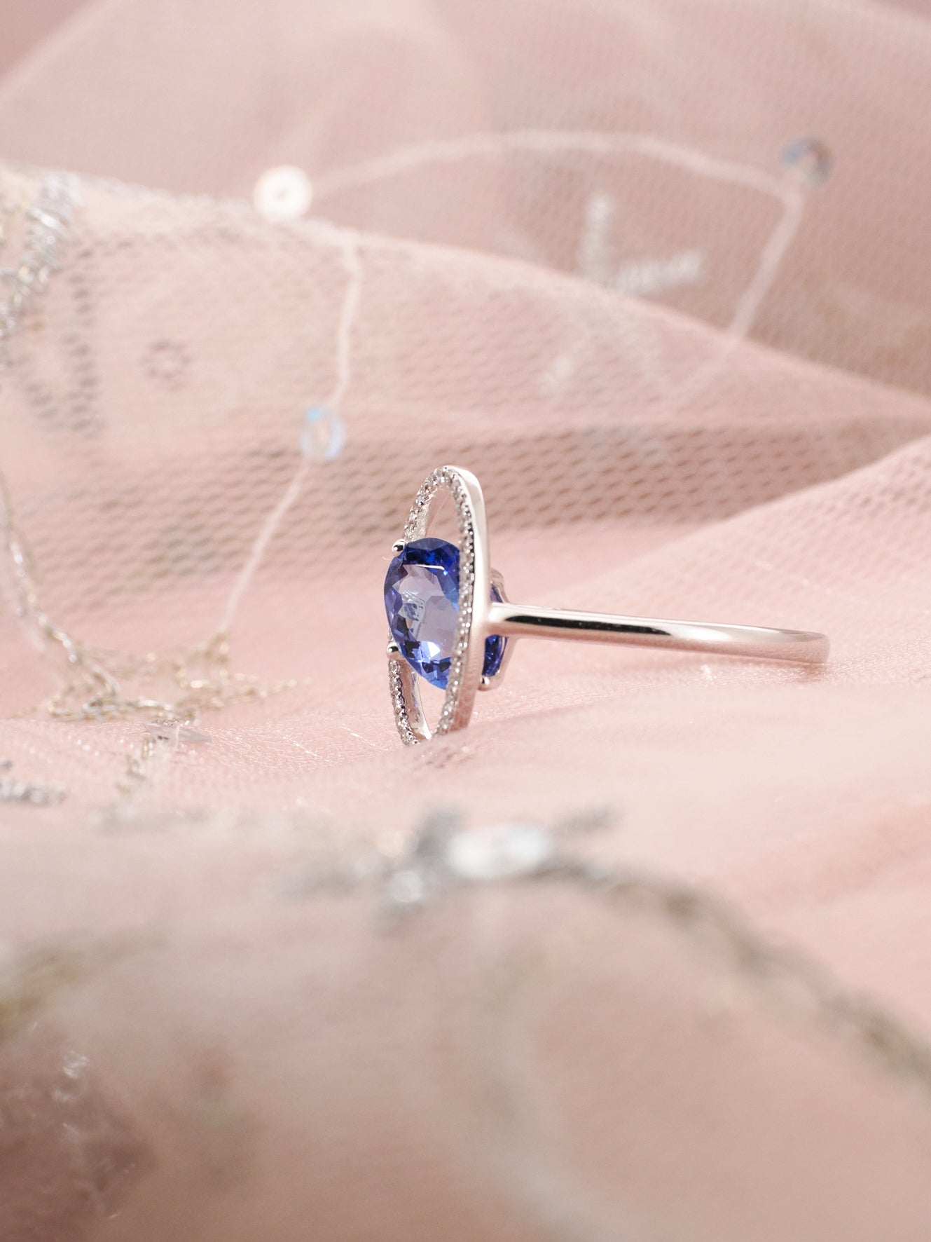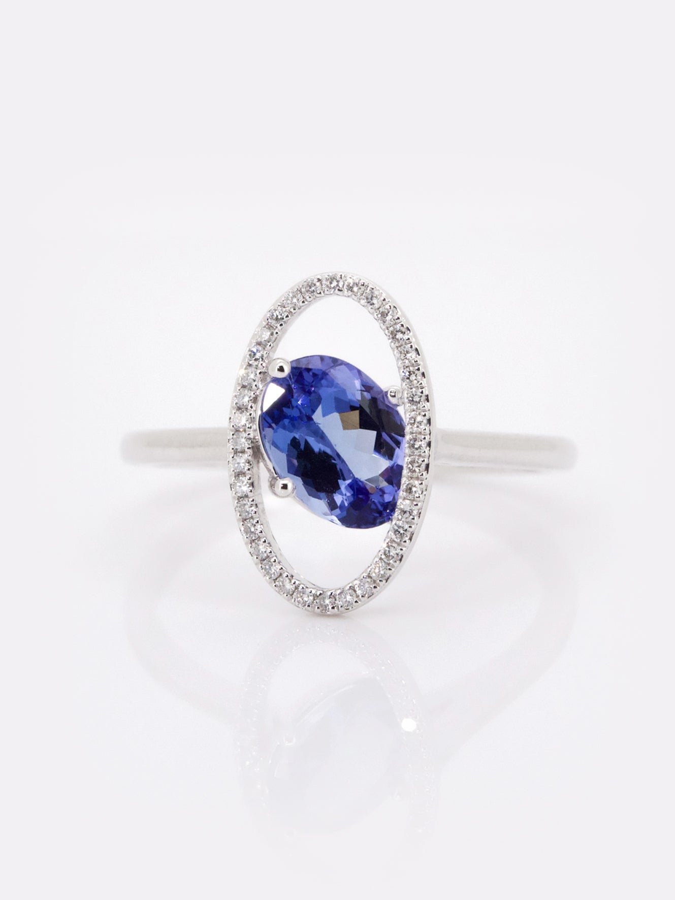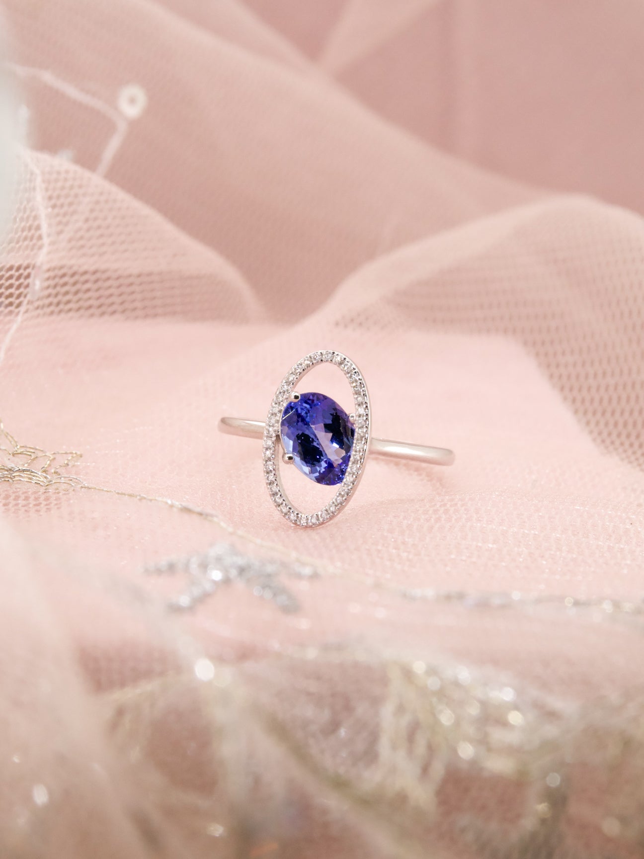This playful 14K gold ring embraces an intentionally unbalanced aesthetic, inspired by the asymmetrical silhouette of Saturn. It features a dazzling tanzanite—the December birthstone—encircled by a diamond halo. The tilted, off-center setting gives the ring a sense of fluid motion and spirited vitality, as if touched by a subtle magic.