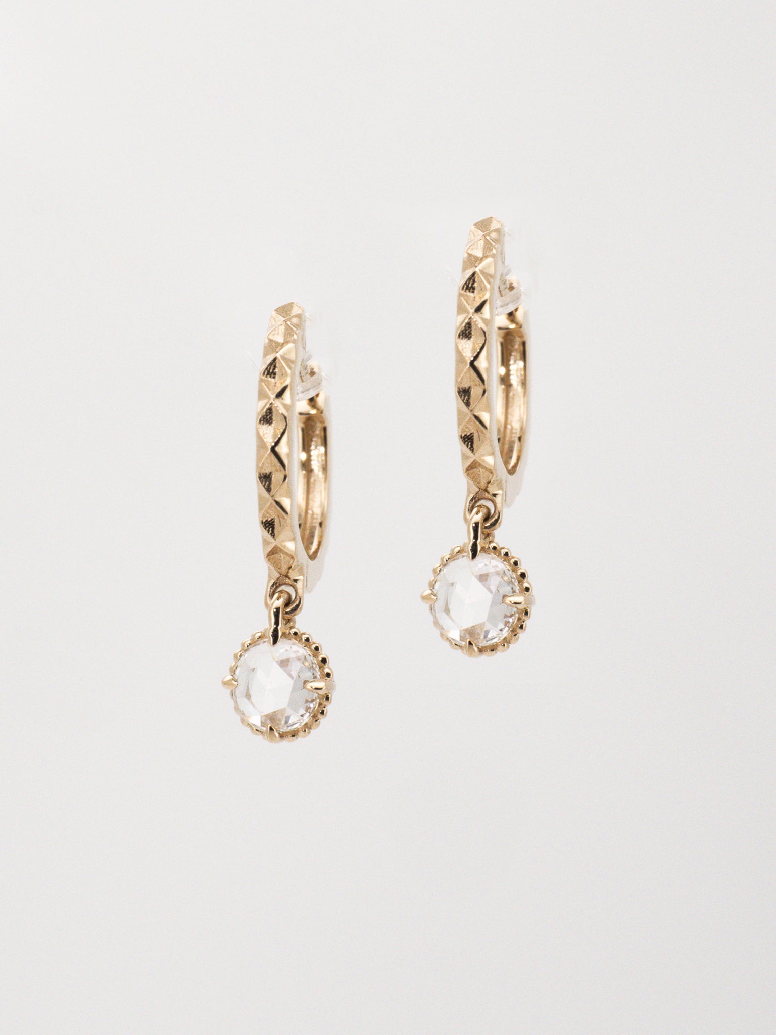Adorn yourself with elegance and grace with our 14K gold huggie hoop earrings. Featuring rose-cut lab-grown diamonds that radiate dazzling brilliance, each hoop is engraved with rhombus motifs. With their vintage-inspired look, these earrings are perfect for everyday wear or special occasions.