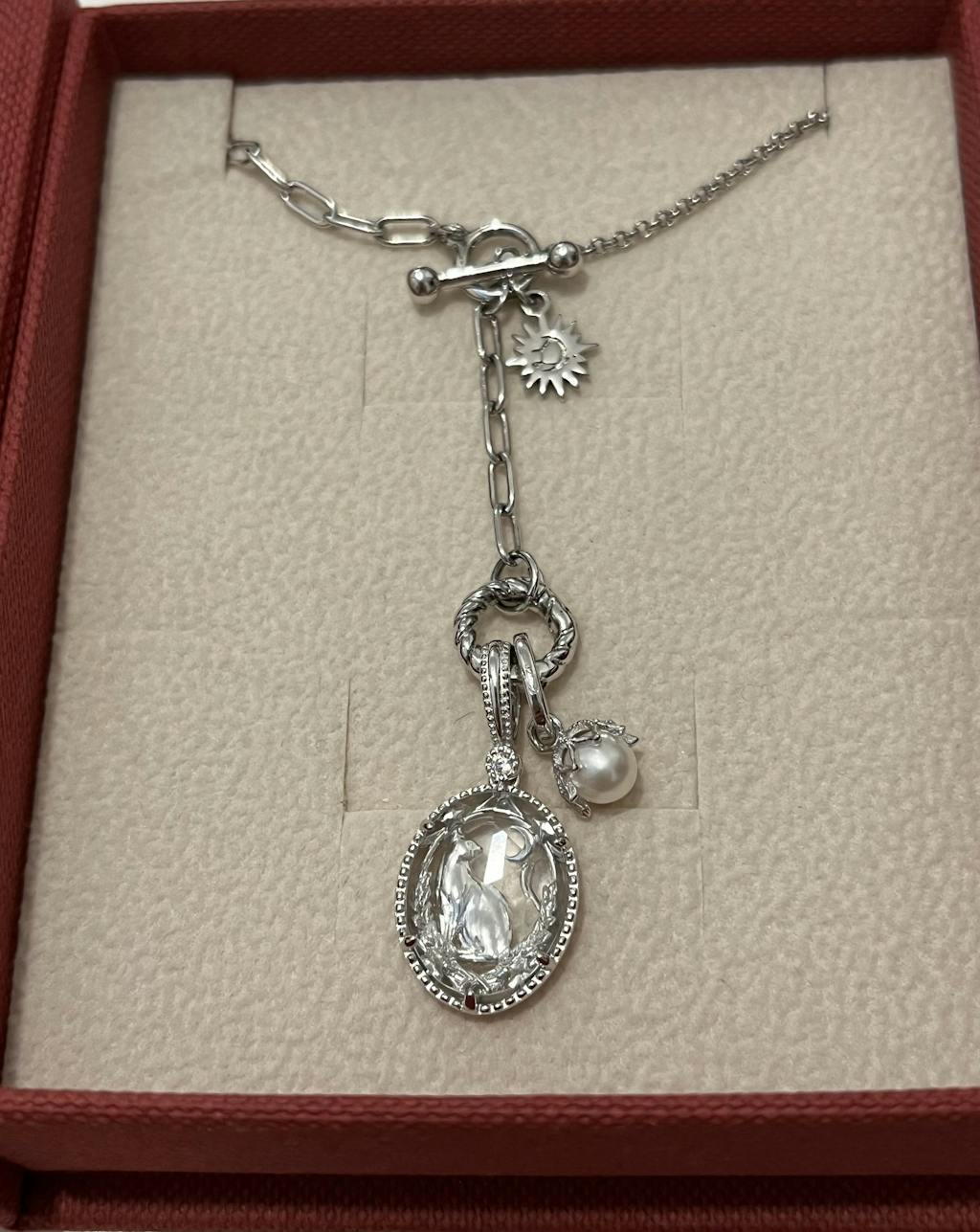 這款白水晶吊墜中鑲有一隻仰望新月的柴郡貓,如同對新一年的期盼。白水晶純淨的磁場有助清理混亂的思緒,讓你冷靜檢視內心,並增強身心靈的能量。玫瑰切割的橢圓形白水晶隨著光線折射,透出如鑽石般純潔璀璨的光芒。讓他成為你的護身符,在新一年為你帶來光明正面的新開始。